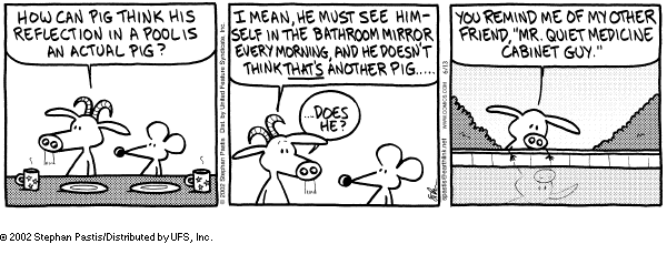 "Mr Quiet Medicine Guy" is pig's reflection in the bathroom mirror.