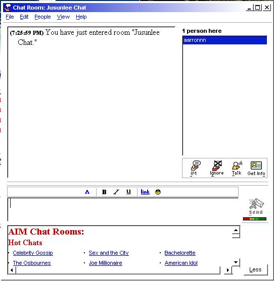 quote:Originally posted by YaaMaKoh imma idle in the chatroom... haha yah lets all leave ur aim on in the jsl chatroom