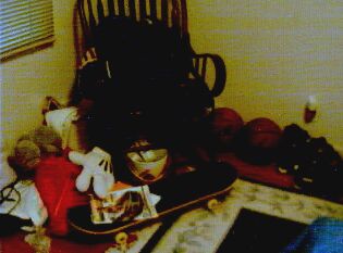 my shoes, shoe cleaner, orange juice, air freshener, rollerblades, and 2 bballs